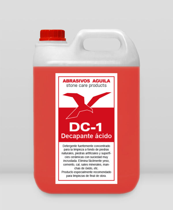 DC-1 decapante (ácido) fuertemente concentrado para la limpieza a fondo de suciedad muy incrustada. Elimina fácilmente yeso, cemento, cal, sales minerales, manchas de óxido, etc. Producto especialmente recomendado para limpiezas de final de obra. Precio por envase. Envase 5 Lt Manténgase fuera del alcance de los niños. No ingerir. Restringido a usos profesionales. Consérvese únicamente en el recipiente de origen. Contiene ácido fosfórico, ácido clorhídrico. Contiene perfumes